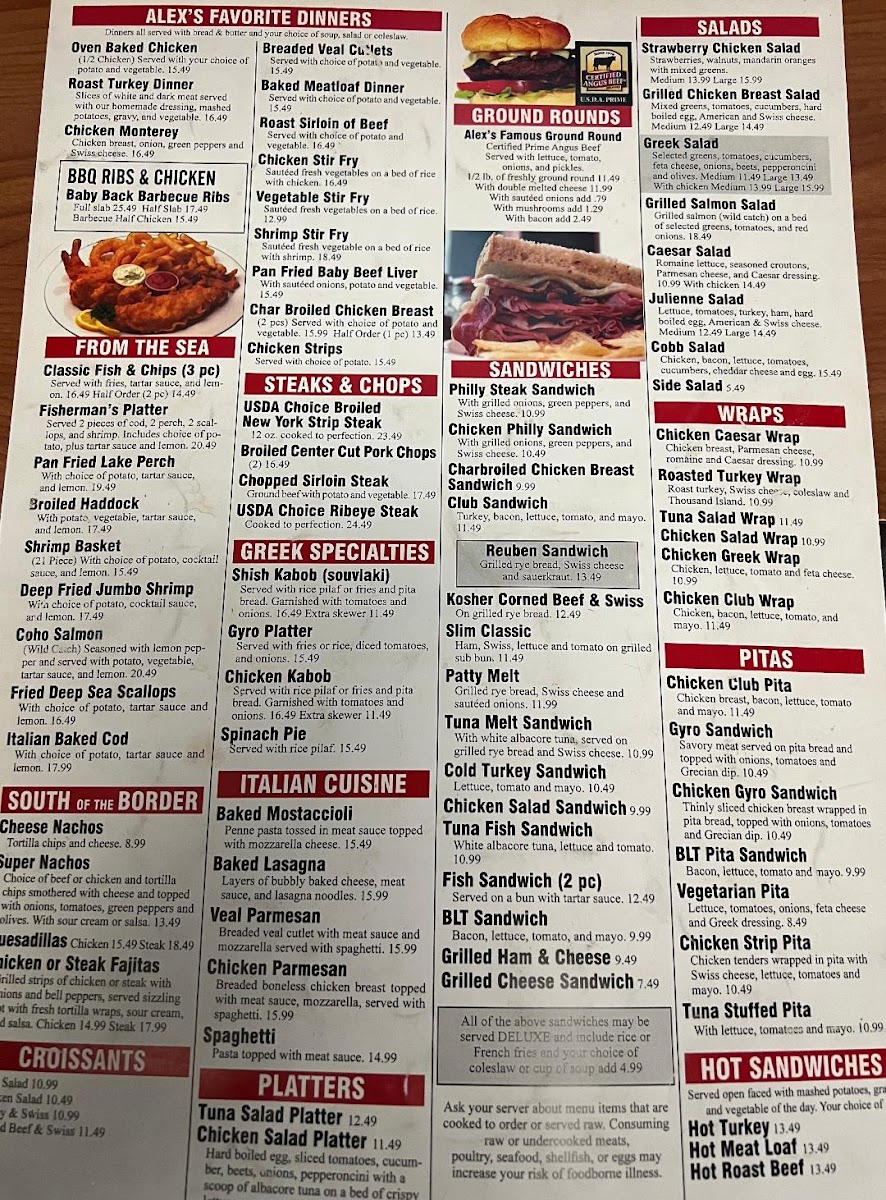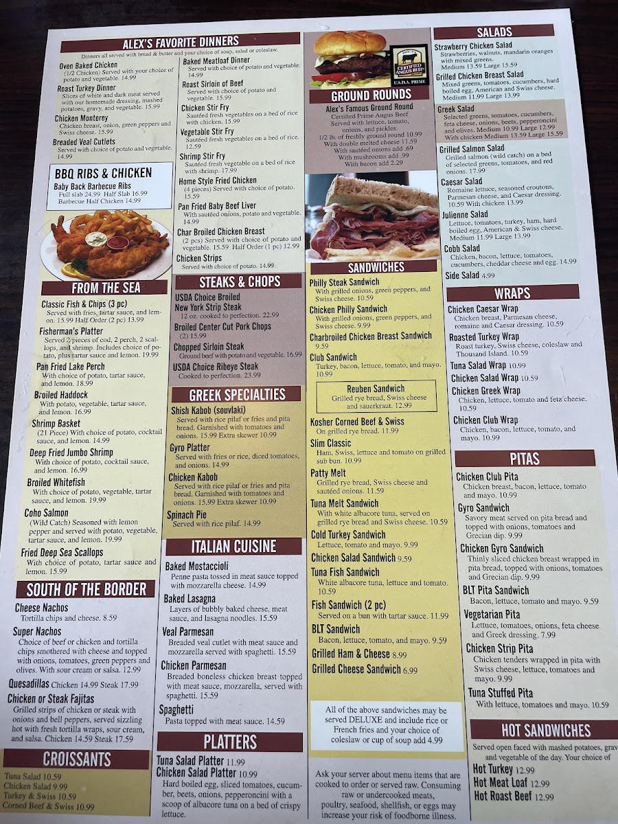Alex’s inviting atmosphere invites both leisurely dinners and quick lunches, making it a perfect choice for any occasion. From cozy family gatherings to casual outings with friends, the restaurant’s ambiance enhances every meal. Sheryl shares that it’s a “neighborhood diner with a nice varied menu,” ensuring there’s something for everyone. You’ll find friendly faces willing to go the extra mile to make your visit memorable, often remembering regular customers' favorite dishes — a true testament to their excellent service.